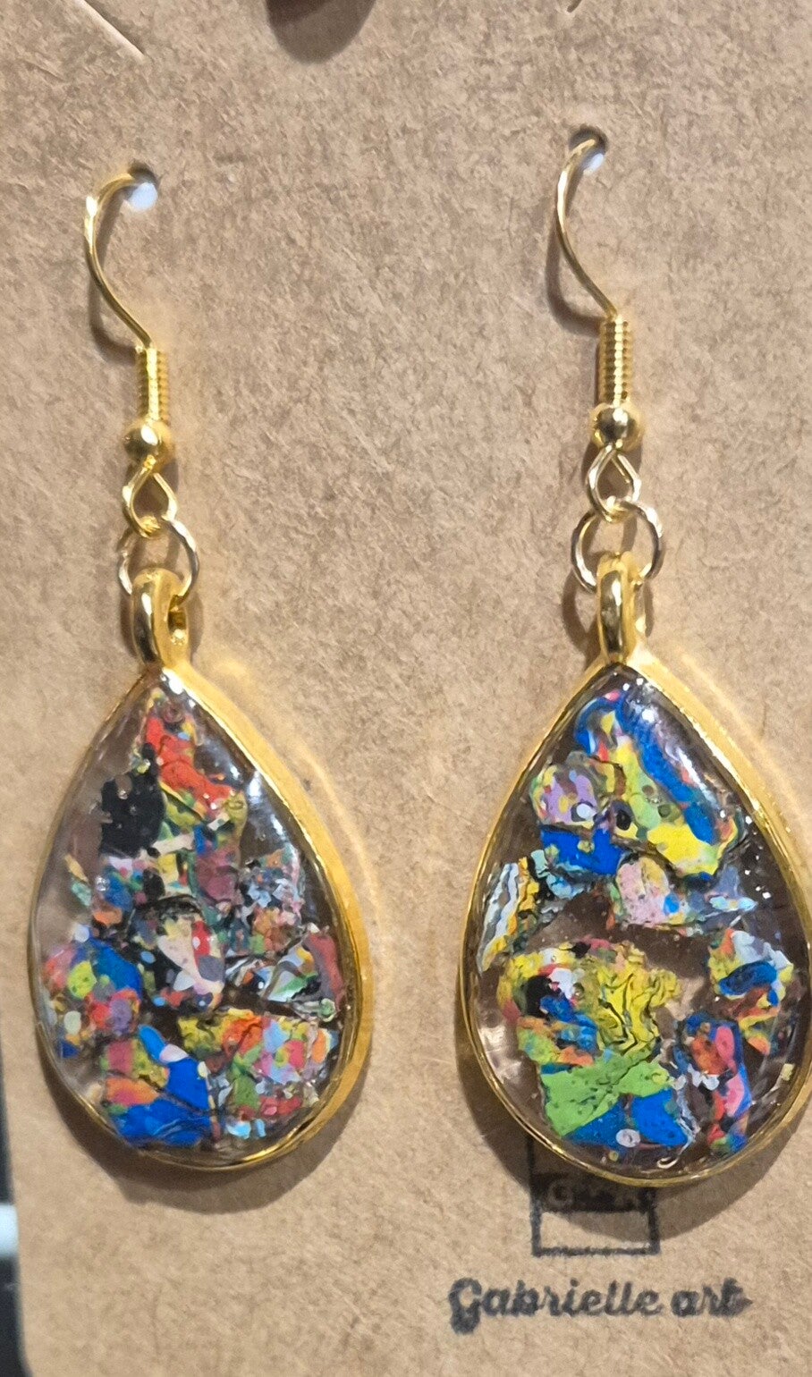 Ik werk met verschillende materialen zoals eigen verfresten, droogbloemen, pigmenten, metaalflakes en andere bijzondere materialen die samen een klein kunstwerk vormen.